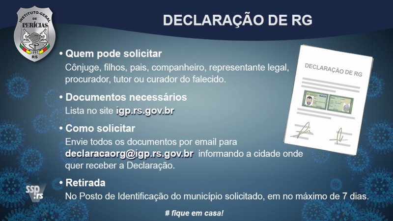 A Declaração de RG – que informa o número do documento de identidade de pessoas falecidas – já pode ser solicitada por e-mail para o IGP. Ela é utilizada por familiares de pessoas falecidas, que necessitam do número do documento para dar andamento a processos judiciais. O encaminhamento, que antes era presencial, agora pode ser feito para o e-mail [email protected]. Os documentos necessários devem ser enviados escaneados para este e-mail, para análise. Se estiverem corretos, o solicitante receberá a resposta contendo a data de retirada da Declaração, que deve ser feita em até sete dias após a análise e aprovação dos documentos.
