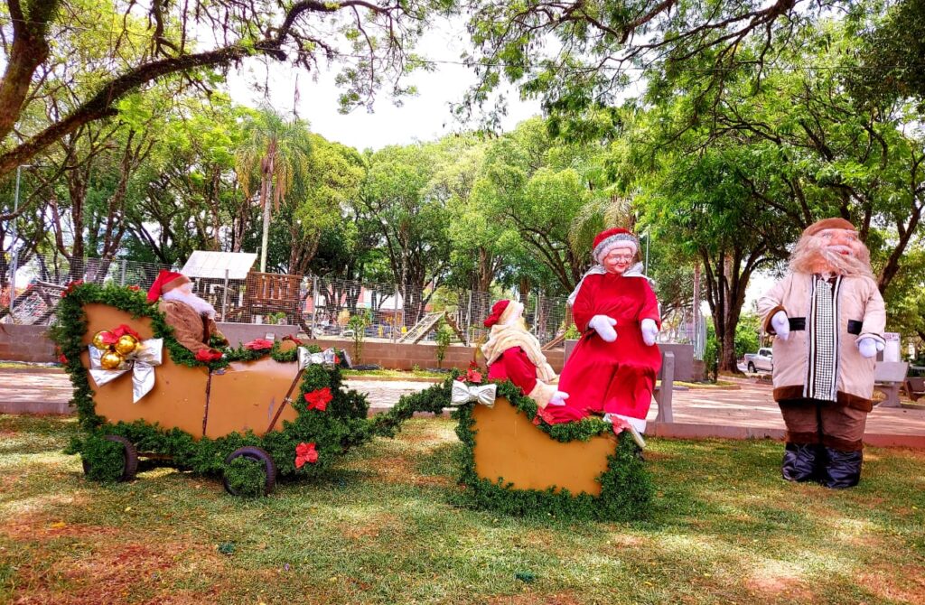 O material que está sendo usado para o enfeite da praça central é de anos anteriores que está sendo reaproveitado em novos cenários, com amplo espaço aberto para as famílias terem momentos de lazer em meio aos enfeites.