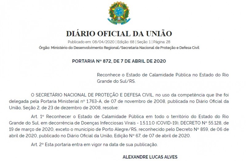 Terça-feira (7), a portaria nº 872 do Ministério do Desenvolvimento Regional (MDR), por meio da Secretaria Nacional de Proteção e Defesa Civil, reconheceu o Estado de Calamidade Pública em todo o território do Rio Grande do Sul, em decorrência de Doenças Infecciosas Virais (COVID-19). Exceto o município de Porto Alegre/RS, reconhecido pelo Decreto Nº 859, de 06 de abril de 2020.