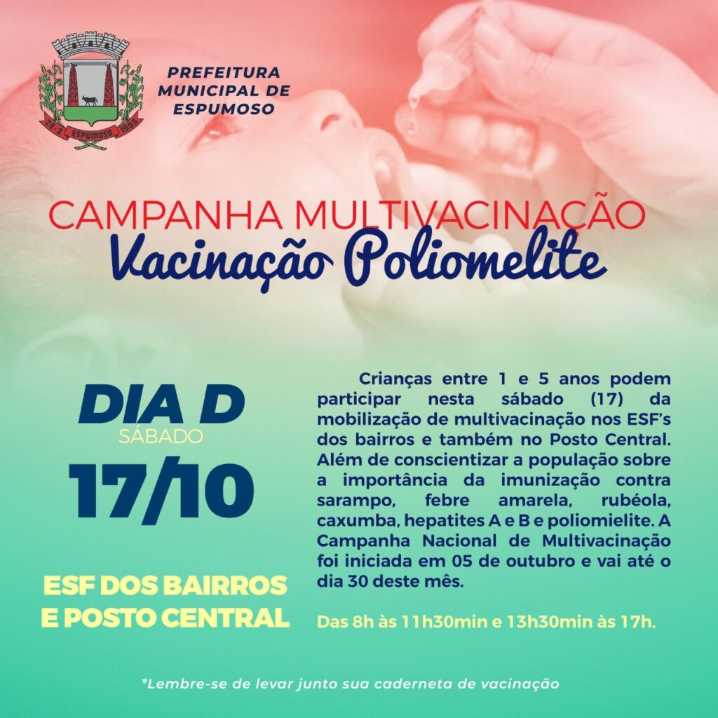 Neste sábado (17), a Secretaria Municipal de Saúde estará realizando o “Dia D” das campanhas de vacinação contra a poliomielite e a da multivacinação.