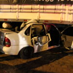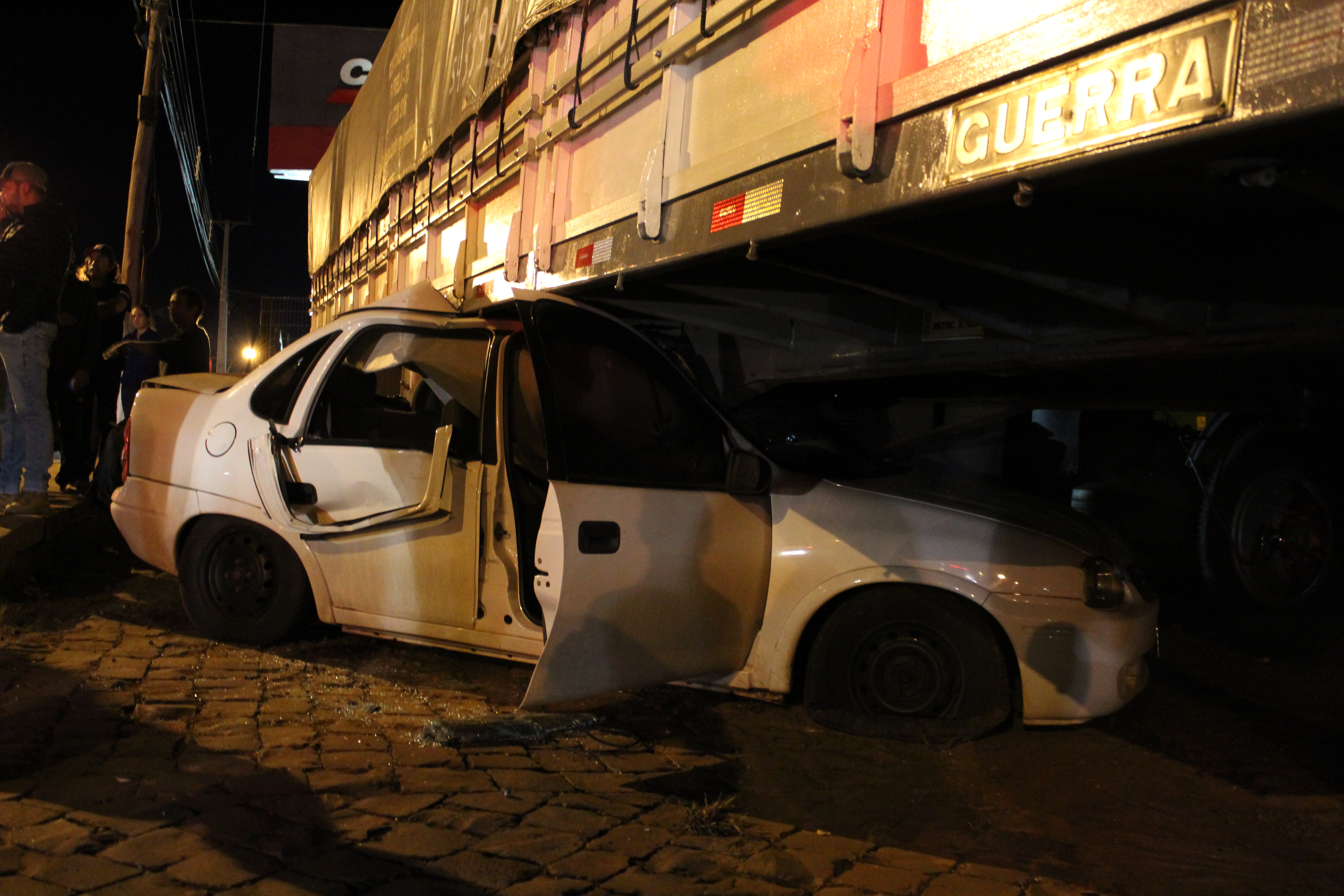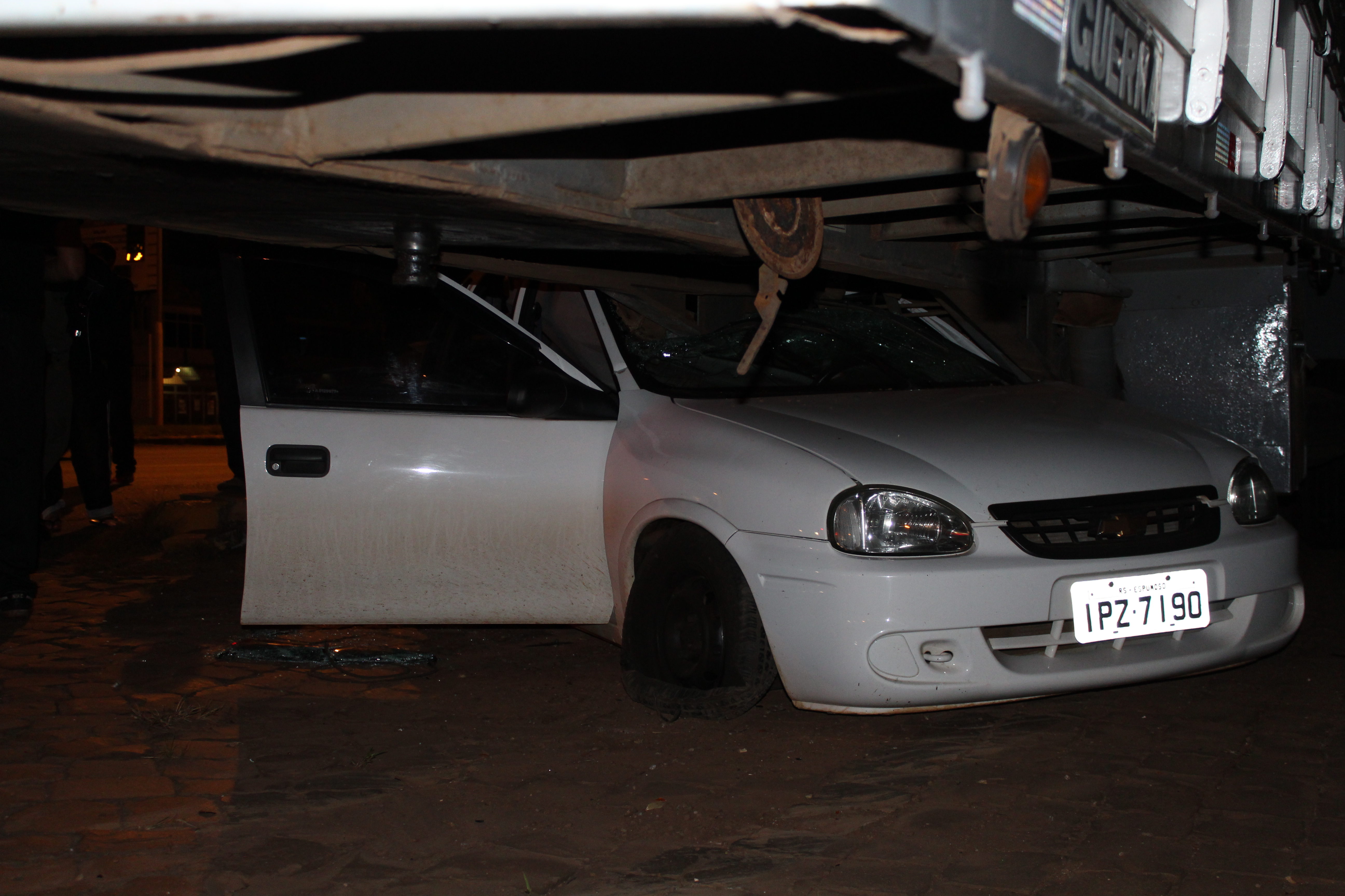A força da colisão espantou todos, visto que o veículo foi parar embaixo do “cavalinho” da carreta.