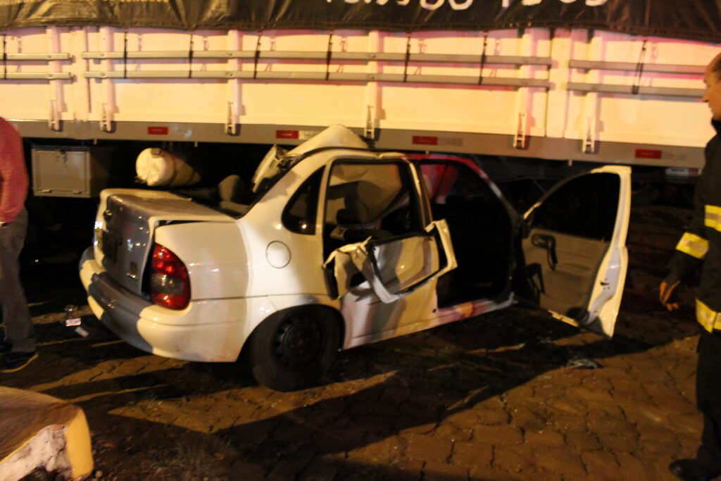 De acordo com as informações, o motorista do Corsa perdeu o controle do veículo e colidiu na Carreta que estava estacionada no pátio de uma borracharia.