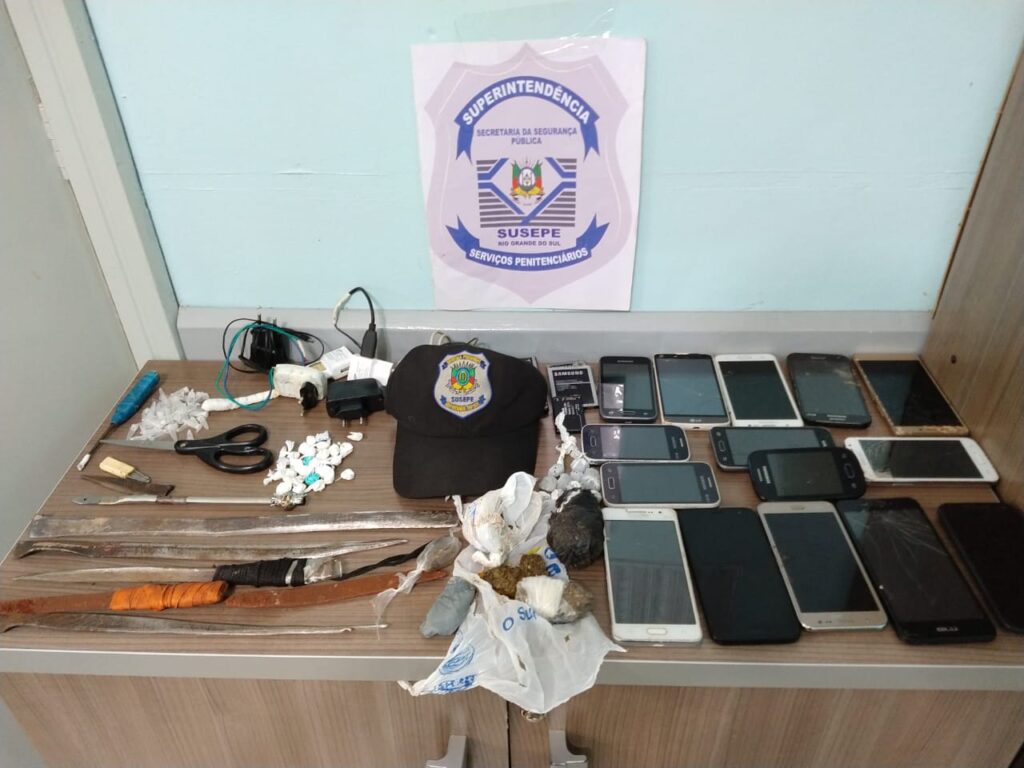Na ação, foram retirados das celas 1, 2 , 3 e 4 , 15 aparelhos celulares, porções de substância semelhante à maconha, 28 buchinhas de pó semelhantes à cocaína, seis carregadores de celular e dez facas artesanais (estoques).