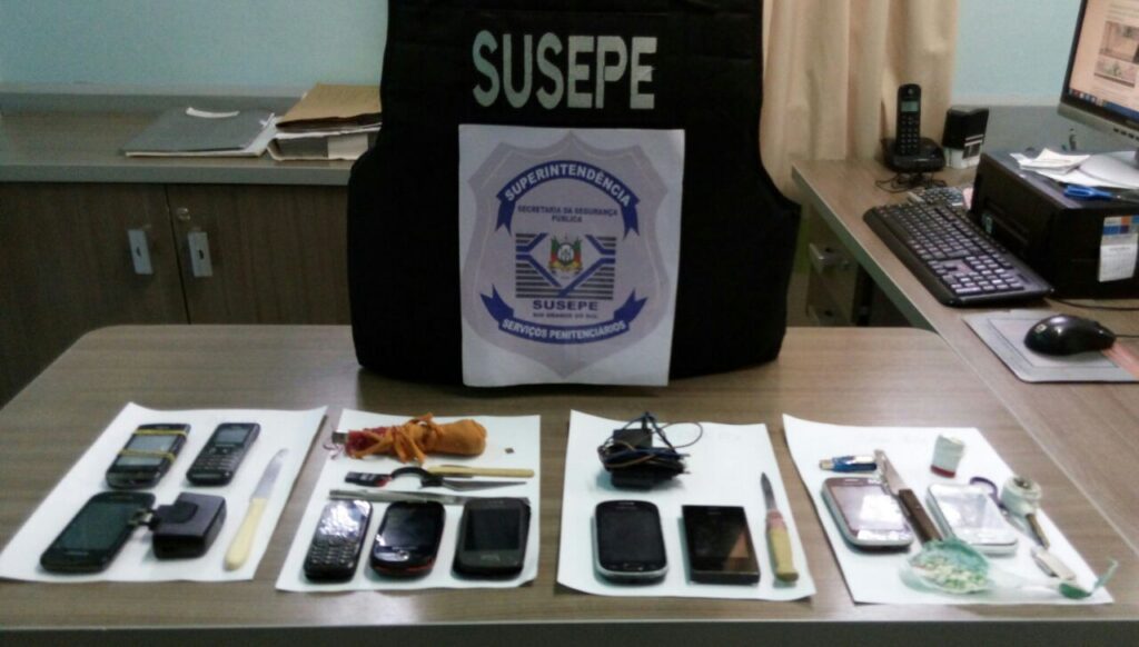 Foram encontrados na cela 01: 03 celulares, 01 carregador e um stock (faca artesanal); na cela 02: 03 celulares e 03 stocks, na cela 03: 02 celulares, 01 stock e 01 carregador, na cela 04: 02 celulares, 27 pedras de crack e 02 stocks.