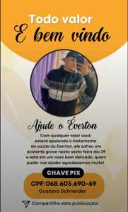 Como o motorista da caminhonete ainda não se apresentou, não há como contar com ajuda financeira, então os amigos do Everton se reuniram e estão promovendo um pix solidário para ajudar a família em casa e no hospital, já que há necessidade de acompanhamento 24h.