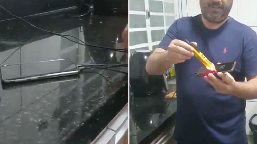 “Isso significa que o celular está energizado e que é um perigo você falar no celular com ele carregando. Pode ser fatal”, diz o homem em tom de alerta ao mostrar que o dispositivo detecta tensão no cabo e no próprio aparelho.