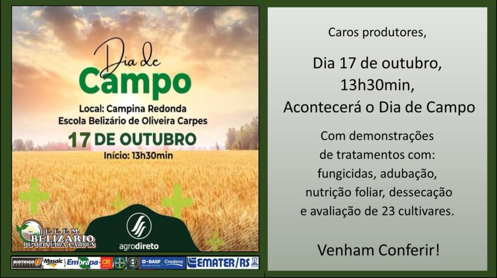 A Escola Estadual de Ensino Médio Belizário de Oliveira Carpes, da Campina Redonda em Espumoso, promove no próximo dia 17 de outubro, a partir das 13h30min, Dia de Campo com demonstrações de tratamentos com fungicidas, adubação, nutrição foliar, dessecação e avaliação de cultivares.