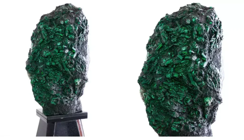 Encontrada em agosto deste na Serra da Carnaíba, no Norte da Bahia, a esmeralda está disponível para leilão até o próximo dia 28 pela Positivo Leilões, de São Paulo. A peça é guardada em São Paulo, sob forte esquema de segurança.