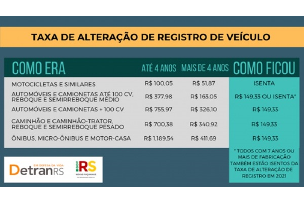 O novo valor da taxa de alteração de registro do DetranRS, paga nos serviços de transferências de propriedade de veículos, entra em vigor nesta segunda (3/5). Antes com dez faixas de preço que variavam conforme o tipo, a potência do motor e a idade do veículo, que chegavam a custar R$ 1.189,54 (no caso de um ônibus de até quatro anos de fabricação), agora tem valor único fixado em R$ 149,33 para todos os veículos.