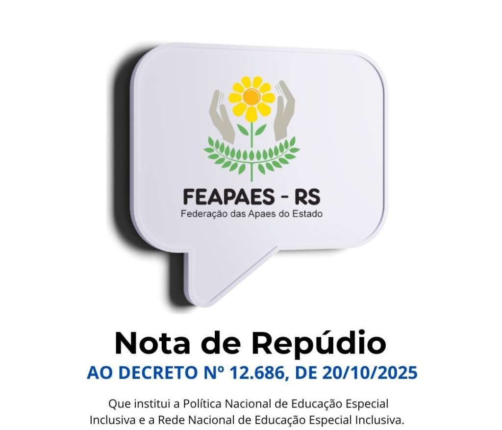 “A Federação das APAEs do Estado do Rio Grande do Sul manifesta, por meio desta, sua profunda preocupação e convoca toda a comunidade Apaeana RS, incluindo entidades, profissionais e famílias engajadas na educação especial, a expressar seu veemente protesto contra o Decreto nº 12.686/2025, divulgado pelo Ministério da Educação, em 21 de outubro de 2025, que estabelece a Política Nacional de Educação Especial Inclusiva.