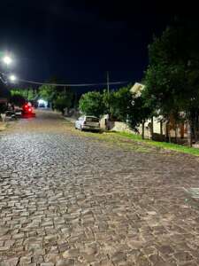 Fios de postes estão caídos formando um “varal” de um lado a outro da rua.