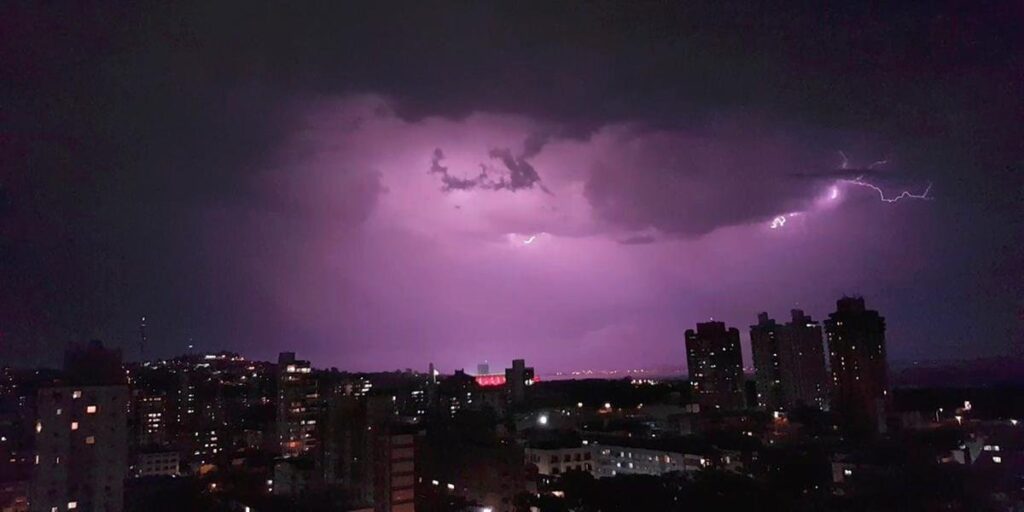 De acordo com a MetSul Meteorologia, a chuva já começa de manhã em alguns municípios, mas avança e aumenta muito da tarde para a noite. A maior nebulosidade impede o calor intenso, mas segue a sensação de abafamento.