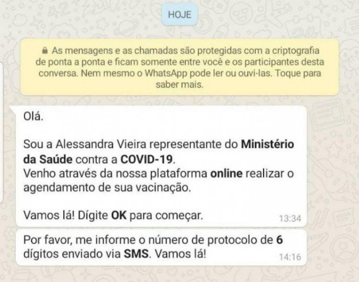 Em novo golpe no WhatsApp, criminosos enviam mensagens para usuários se passando por funcionários do Ministério da Saúde. A conversa dos golpistas é que o contato é necessário para fazer um cadastro para vacinação contra a covid-19. O alerta foi dado esta semana por empresas de cibersegurança.