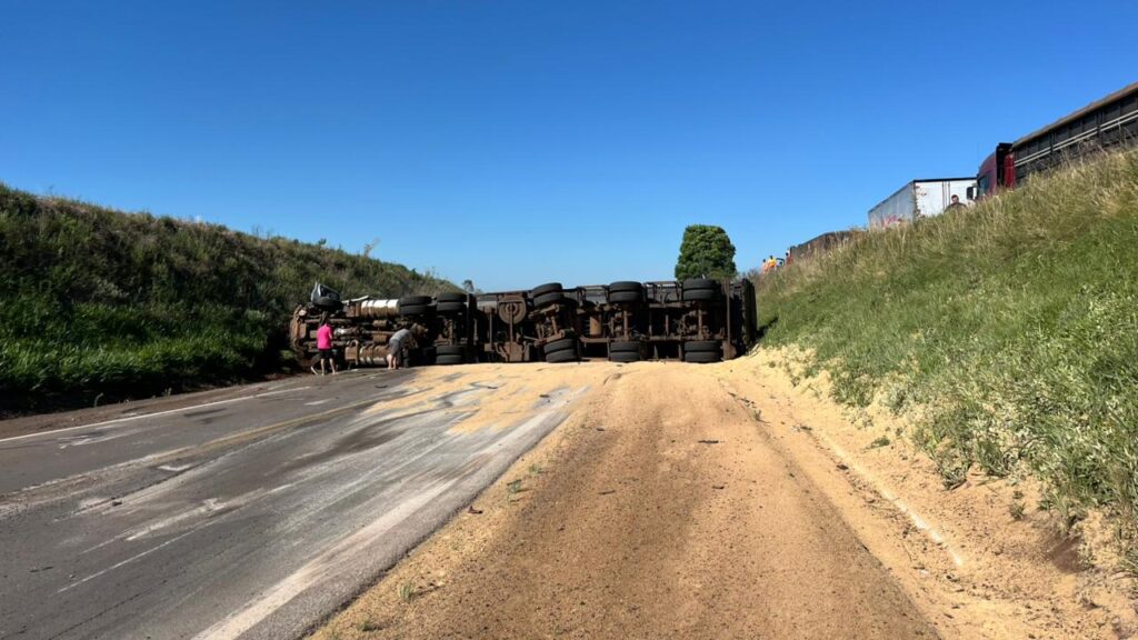 Um grave acidente de trânsito envolvendo uma caminhonete Renault Oroch, placas da Argentina e uma carreta, carregada de farelos, ocorreu por volta das 08h desta terça-feira, 06 de janeiro, na BR 285, em Passo Fundo, próximo da Agrícola Ferrari, no trecho que liga Passo Fundo a Carazinho. Com a colisão a carreta tombou e bloqueou a pista nos dois sentidos.