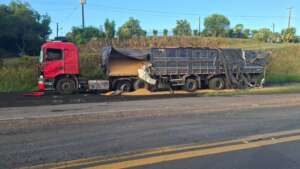 A colisão envolveu duas carretas, sendo uma com placas de Maracajá, em Santa Catarina, e outra de São Borja, no Rio Grande do Sul. Com a força do impacto, o condutor de um dos veículos envolvidos não resistiu aos ferimentos e morreu ainda no local.