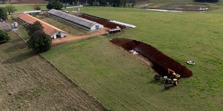 Escavadeira trabalha em granja comercial, local do primeiro surto de gripe aviária do país, em Montenegro (RS) | Foto: Silvio Avila / AFP / CP