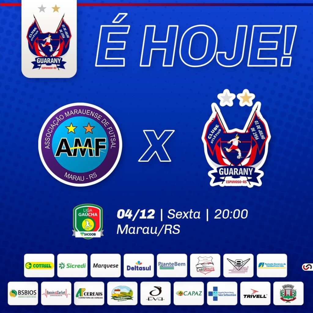 Logo mais, 20 horas, o Guarany e AMF entram em quadra no Ginásio Municipal Jatyr Francisco Foresti, em Marau, para o jogo de ida das quartas de finais da Liga Gaúcha de Futsal 2020.