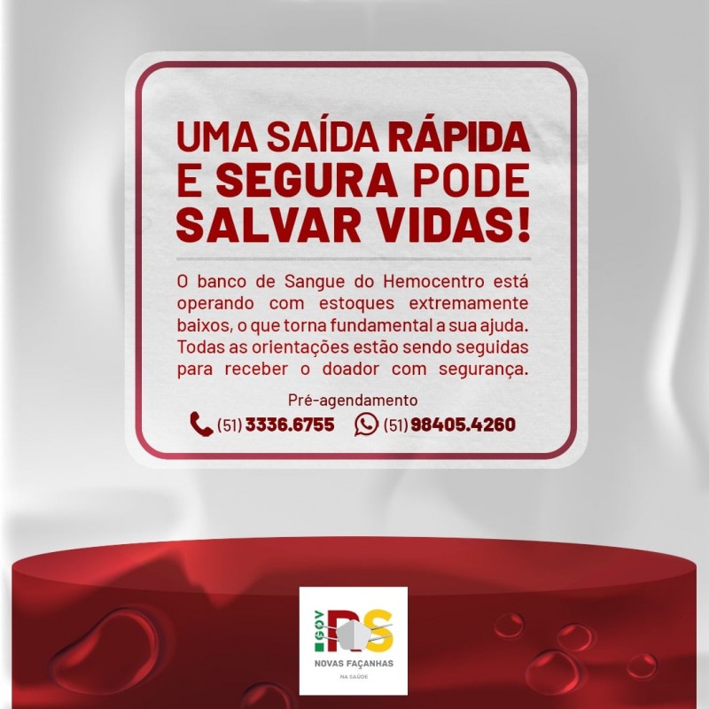 O Hemocentro do Rio Grande do Sul (Hemorgs) está com os estoques de sangue muito abaixo do necessário para atender a demanda de 42 hospitais e precisa de doações de todos os tipos sanguíneos.