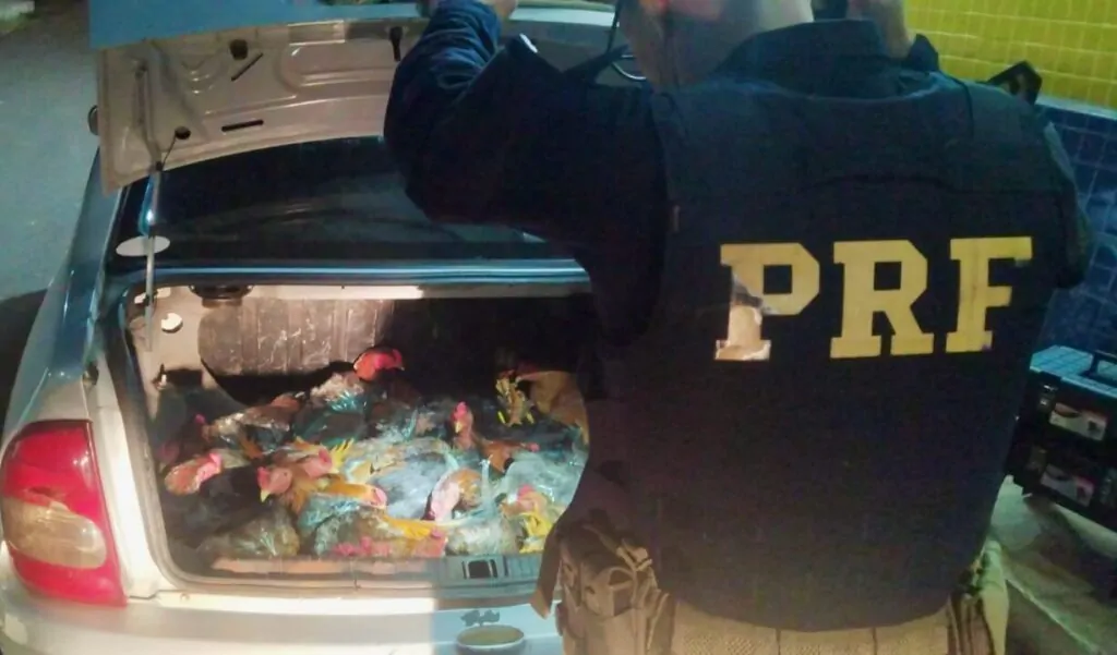 Durante uma fiscalização de rotina, os agentes abordaram um GM Corsa e perceberam animais sob os pés do caroneiro do banco traseiro. Ao revistar o porta-malas, encontraram 26 galos da raça “mura brasileiro”, popularmente utilizados em rinhas, todos em condições precárias, sem água e sem possibilidade de se movimentarem.
