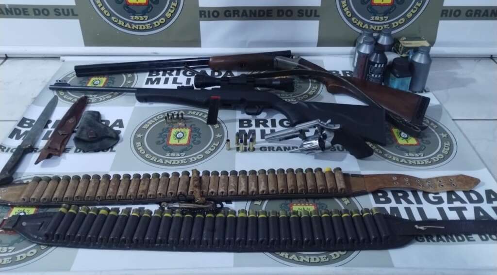 As guarnições dirigiram-se à residência e, ao abordar o autor, encontraram um Revólver calibre .38 em seu bolso direito, com 5 munições intactas, e uma deflagrada no bolso esquerdo. No interior da casa, foram localizadas mais duas armas: um rifle calibre .22 com 8 cartuchos intactos e uma Espingarda Calibre .20 com 81 cartuchos íntegros, ambas devidamente registradas.