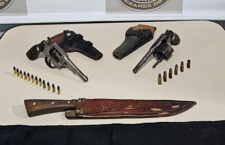 Durante a busca pessoal foram localizados dois revólveres, sendo um de calibre .32, com cinco munições intactas e uma deflagrada, e outro de calibre .22, com coldre de couro e doze munições intactas. Durante busca veicular foi localizada ainda uma faca com 25cm de lâmina.
