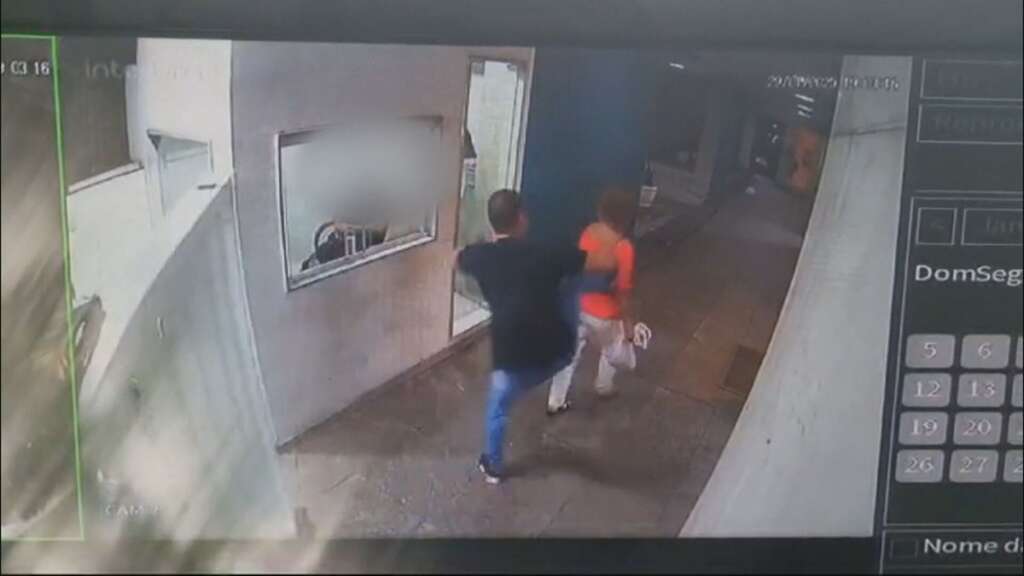 Imagens das câmeras de segurança mostram Maria de Fátima Silva Pires, de 68 anos, levando um chute nas costas logo depois de passar pelo portão. O caso aconteceu na quarta-feira (29).