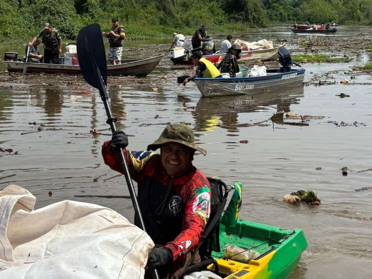 O volume de lixo era tão grande que formou uma “ilha de lixo”, obstruindo parcialmente o curso natural do Jacuí. Entre os materiais coletados estavam garrafas PET, plásticos, vidro, isopor e outros resíduos arrastados pelas enchentes e pelo descarte irregular, especialmente vindos da região de Passo Fundo.