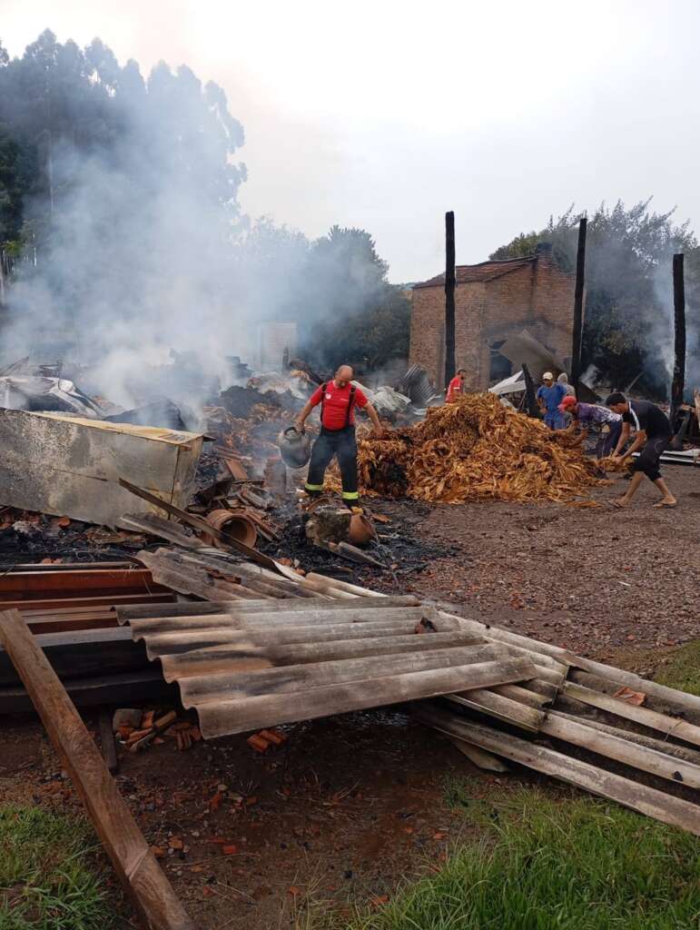 De acordo com os Bombeiros, o fogo atingiu uma residência, dois galpões e causou grandes prejuízos materiais. Entre os itens consumidos pelas chamas estão cerca de 600 arrobas de fumo já processado e armazenado em pilhas, além de um automóvel, uma motocicleta, três carroças e maquinários utilizados no trabalho rural.