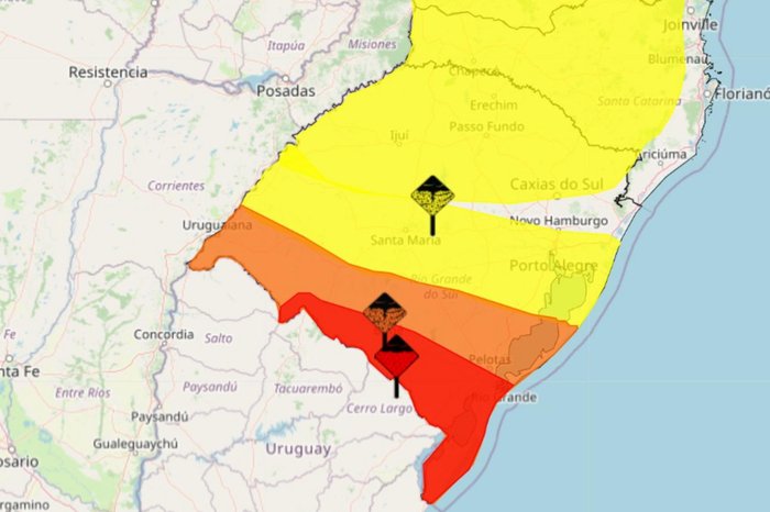 O Inmet (Instituto Nacional de Meteorologia) emitiu três alertas para o Rio Grande do Sul. O mais severo destaca perigo de grandes volumes de chuva para a Campanha e o Sul, em municípios como Bagé e Rio Grande. Esse aviso se iniciou nesta segunda-feira (23) e é válido até o meio-dia de quarta-feira (25).
