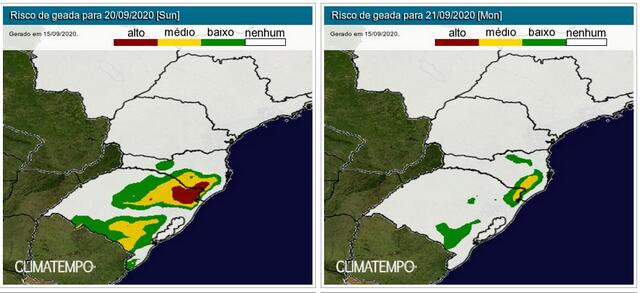 Por outro lado, a intensa massa de ar polar que acompanha esta frente fria irá derrubar as temperaturas nos três estados do Sul do país, e a sensação será de muito frio principalmente entre os dias 19, 20 e 21. A primavera começa oficialmente no dia 22 de setembro, às 10h31 (horário de Brasília).
