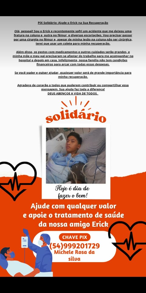 Erick está internado no Hospital São Vicente de Paulo, em Passo Fundo, onde nesse momento está em cirurgia para correção do fêmur quebrado.