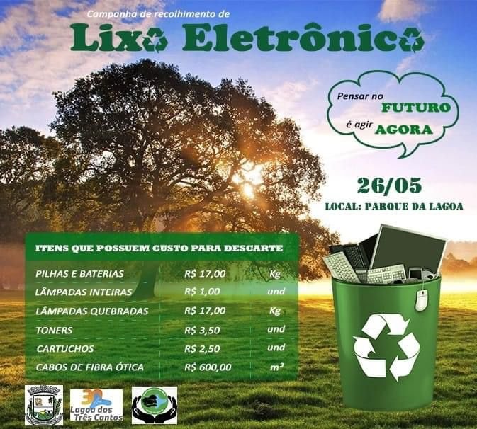 O Departamento de Meio Ambiente, órgão da Secretaria da Agricultura de Lagoa dos Três Cantos estará realizando a campanha de recolhimento do lixo eletrônico nesta quinta-feira (26) no Parque Municipal de Eventos Loura Petry, o Parque da Lagoa Fest.