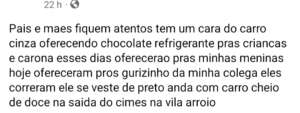 Posts em redes sociais estão denunciando a ação de um homem que estaria assediando crianças no Bairro Arroio. De acordo com relatos enviados para a nossa reportagens, mães estão sendo informadas pelos filhos que na saída da escola um homem estaria dentro de um veículo chamando as crianças para entregar doces para as mesmas.