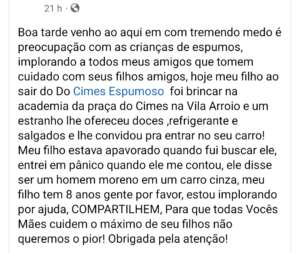 As informações dão conta de que o homem seria alto, moreno e estaria dentro de um carro cinza, possivelmente um Peugeot.