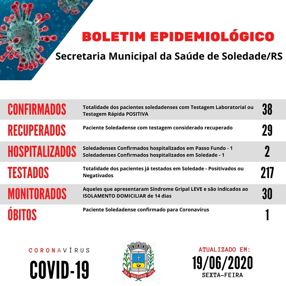 Mais um caso é confirmado de Covid-19 em Soledade, totalizando 38 infectados. Trata-se de uma mulher, de 46 anos de idade.