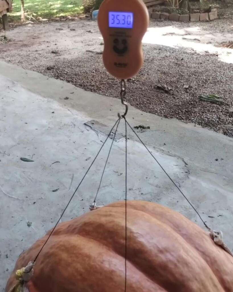 Uma das abóboras chegou a impressionantes 35 quilos e 300 gramas, enquanto a outra marcou 32 quilos e 500 gramas na balança. Um verdadeiro espetáculo da natureza!