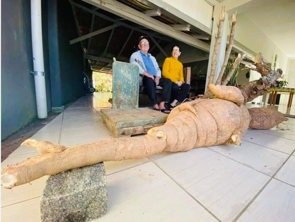 Uma mandioca gigante. São mais de 100 kg em uma raiz com mais de dois metros de comprimento. E essa colheita surpreendente aconteceu em Pomerode (SC), no bairro Ribeirão Luebke. Para o casal Otávio e Wilma Hoeppner, o plantio de verduras e leguminosas no terreno é comum, mas a colheita desta mandioca, com certeza, os surpreendeu. A colheita aconteceu na manhã de quarta-feira, 19 de abril, no terreno da família. O tamanho logo se mostrou incomum, mas foram os números que confirmaram o extraordinário. Com 112 kg e 2 metros e 30 centímetros de comprimento, esta mandioca, com certeza, vai entrar pra história.