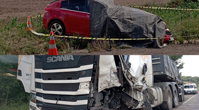 A mulher de 35 anos era caroneira do GM/Cruze com placas de Água Santa que colidiu frontalmente em uma carreta Scania R450, carregada de cimento.