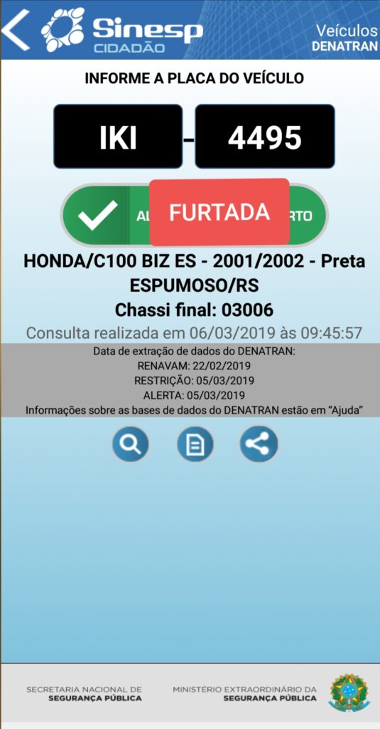 A motocicleta Biz preta, placa IKI 4495 estava dentro da garagem de uma residência, quando foi levada de furto.