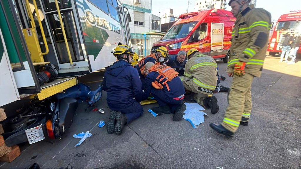 O ônibus precisou ser levantado com suportes e instrumentos especiais para que o motociclista fosse socorrido. Os Bombeiros participaram do resgate e o SAMU conduziu o homem ao hospital com suspeita de fraturas nas pernas, mas estável.