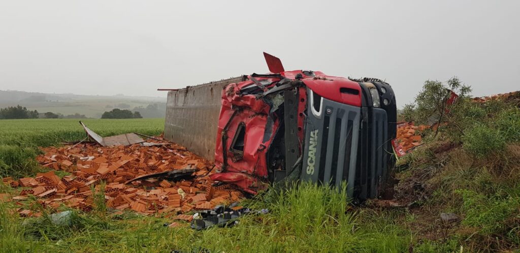 A carreta estava carregada de tijolos e está no mesmo local do acidente aguardando remoção. O trânsito está lento no local. A PRE está atendendo a ocorrência.