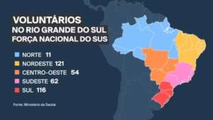 A Região Nordeste, com voluntários vindos de oito estados, é a que mais enviou profissionais para atuar no RS: 121 voluntários, o equivalente a 33,2% do total. Veja os números abaixo.