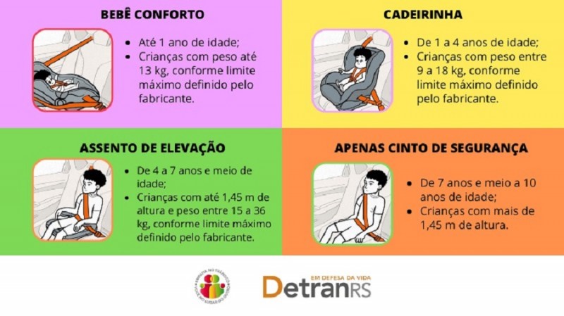 A diretora institucional do DetranRS, Diza Gonzaga, reforça que transportar crianças com o dispositivo correto para idade, peso e altura, muito mais do que uma exigência legal, preserva e protege a vida das nossas crianças e traz maior segurança para os demais ocupantes do veículo.