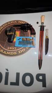 Foi procedida abordagem, e durante a revista foi localizado em sua cintura um revólver marca Taurus, calibre .38, municiado. Na sequência, procedeu-se à busca veicular, sendo encontrada uma cartucheira contendo 6 munições, além de uma cartela fechada de munições, mais duas facas.