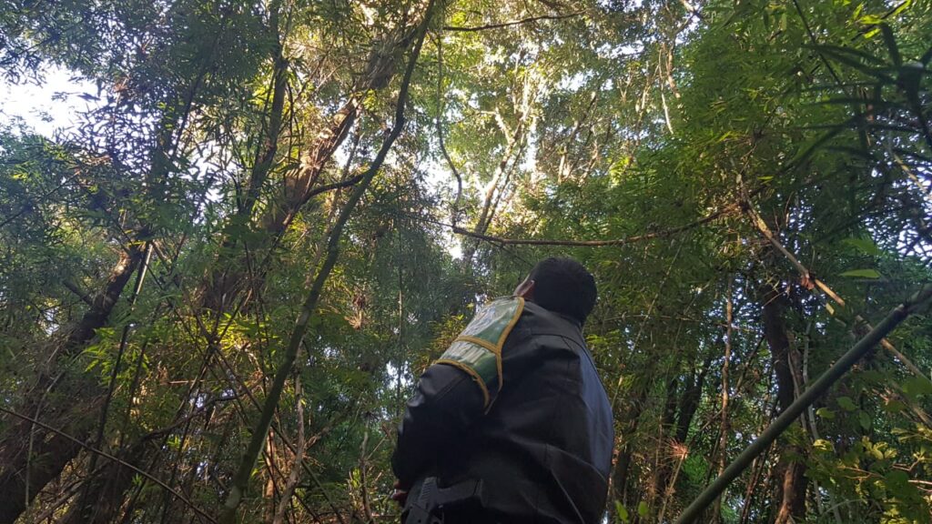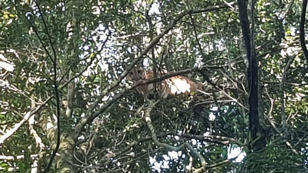 Depois de fazer o registro, nós acionamos e voltamos ao local junto com os Soldados Juliano e Edson da Patrulha Ambiental da Brigada Militar de Cruz Alta e para a alegria dos soldados, a onça estava quase que no mesmo local, agora, mais à vontade.