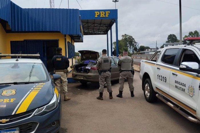 Com o apoio da Brigada Militar, a PRF realizou um cerco na região, resultando na localização da dupla após cinco horas de buscas. A revista no veículo revelou a presença de 333,4 quilos de maconha no porta-malas.