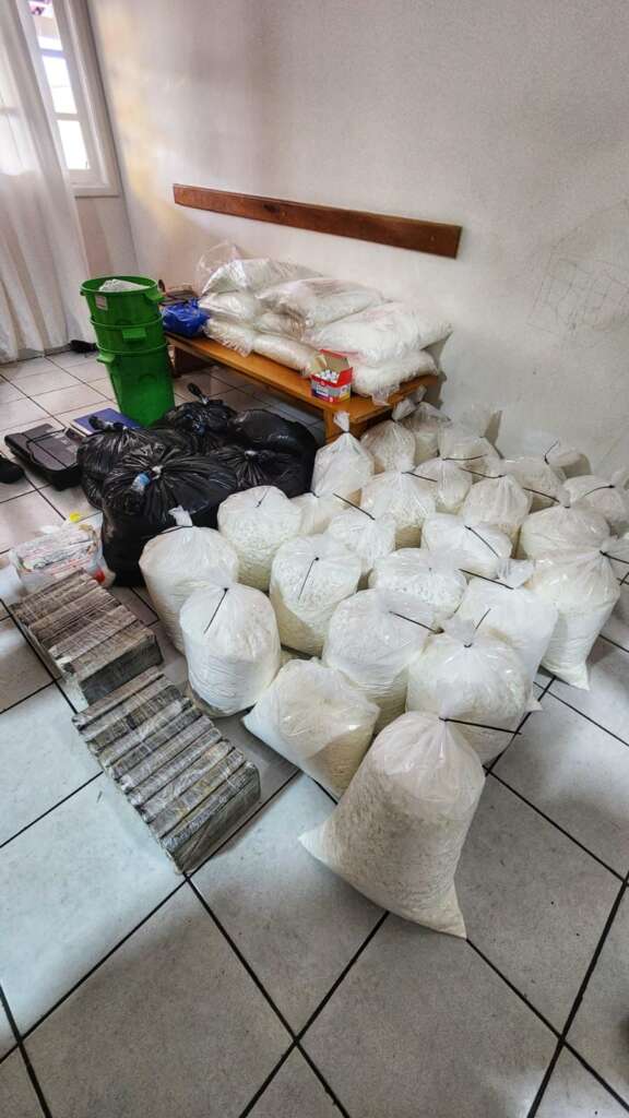 Durante a abordagem foram encontrados nos veículos e no interior da residência cerca de 445kg de cocaína, em diversas sacolas, e cinco pessoas estavam fracionando o entorpecente.