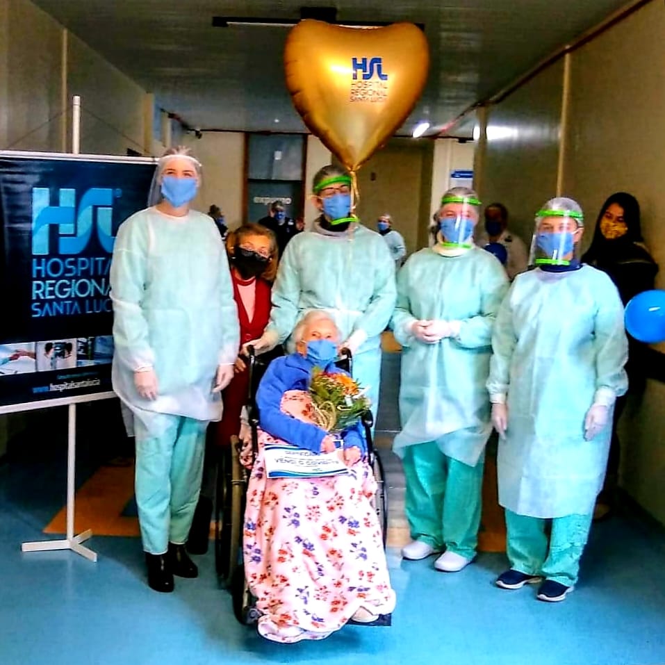 Na tarde da última quarta-feira (15), os colaboradores e direção do Hospital Regional Santa Lucia viveram um momento de muita emoção, quando deu alta a paciente de COVID-19 mais idosa do Estado, MCJ, aos 102 anos de idade.A paciente foi atendida pela Médica Infectologista – Dra Paula Rubin Facco Librelotto e equipe, durante os 13 dias de internação. A médica destaca que a paciente procurou atendimento desde que sentiu os primeiros sintomas da doença e não tinha nenhuma comorbidade. Esse foi o fator relevante para sua cura.O Hospital Regional Santa Lucia se orgulha da sua equipe, para a qual a luta pela vida é a razão de existir!