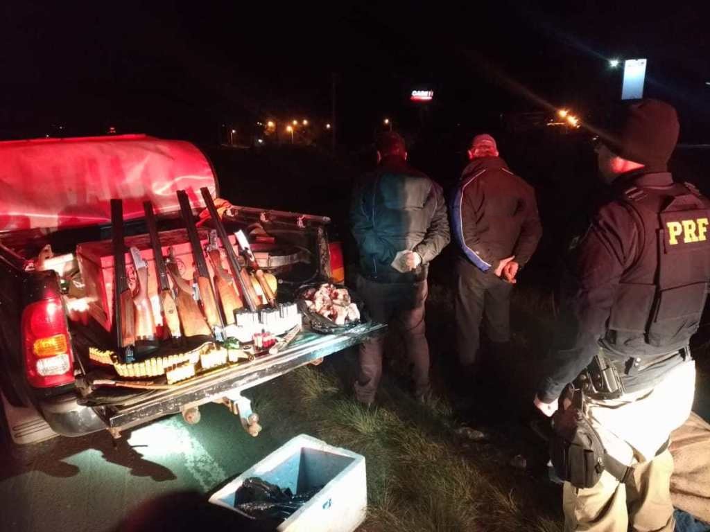 Durante a revista foram encontradas  três espingardas calibre 12;  uma espingarda calibre 20; 99 munições calibre 12; 38 munições de calibre 20 e mais ou menos 30 kg de caça – perdiz. A abordagem foi no início da madrugada de segunda-feira(19). No veículo com placas de Espumoso, estavam pai e filho. Ambos relataram que estavam em uma propriedade rural, no interior do Município para caça, entretanto, não portavam documentos das armas e as mesmas não constavam no sistema da polícia.