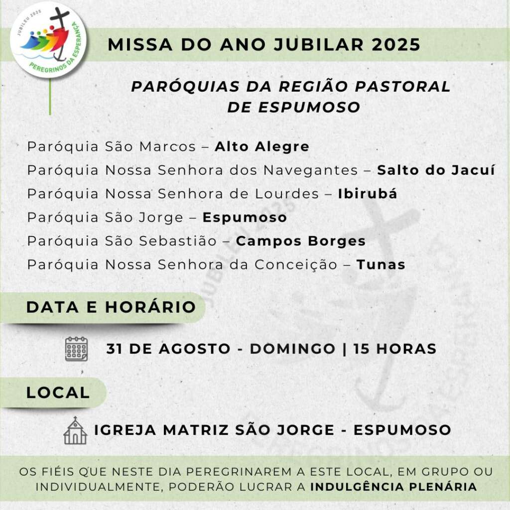 No próximo domingo, 31 de agosto, estarão reunidas em Espumoso as Paróquias São Marcos (Alto Alegre), Nossa Senhora dos Navegantes (Salto do Jacuí), Nossa Senhora de Lourdes (Ibirubá), São Jorge (Espumoso), São Sebastião (Campos Borges) e Nossa Senhora da Conceição (Tunas), para Missa do Ano Jubilar 2025.